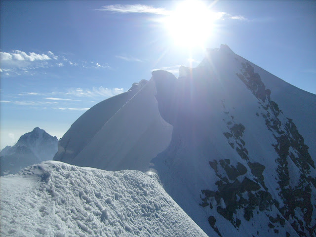 Кеп тоже проваливался, но немного реже, он крался как кошка выискивая плотные островки в размокшем снегу. Идти приходилось по правой части гребня, который стал очень острым и влево свисал большими карнизами. Склон то и дело приносил новые сюрпризы, помимо мокрого и тяжёлого снега, временами он становился похож на оперение волшебной птицы. Поверх льда снег лежал тонкими перьями, на таких кусках выворачивало ноги: кошки, забитые снегом отказывались стоять на льду, снежные перья обламывались при малейшем нажиме — ноги выворачивались и быстро уставали. Гребень вел бесконечными подъёмами и спусками смотря вправо небольшим!