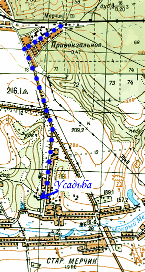 До настоящего времени в том или ином состоянии дошли дворец, служебный коорпус, два флигеля, амбар, ландшафный парк. Дворец был построен в середине 70х годов XVIII века, остальные здания примерно тогда же. Парк был заложен в 1724, потом расширялся. Карта расположения усадьбы в селе Старый Мерчик. |