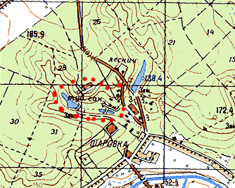Расположена в селе Шаровка Богодуховского района. Основана в начале XIX века, расширялась на протяжении века. Состоит из ландшафтного парка, дворца, и множества других зданий. В советские времена здесь разместили туберкулезный санаторий. Усадьба примечательна прежде всего необычайностью архитектуры, как главного здания, так и служебных построек. Карта окрестностей Шаровки. Красным пунктиром обозначены примерные границы того, что стоит посмотреть. |