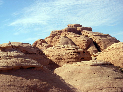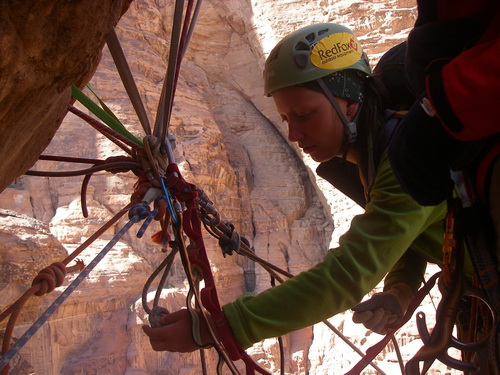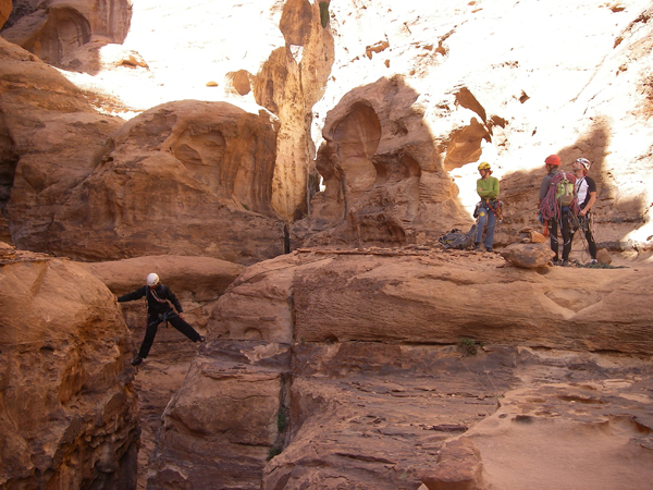 Бедуинские маршруты: Очень запутанные маршруты, сложные для ориентирования. В основном там простое лазание, но встречаются сложные участки. Наверху целый лабиринт из слебов. Многие ночуют на вершине, там есть подготовленные стоянки с дровами. Коммерческие группы водят именно за 2 дня. На The Aye of Allah нам приходилось и спускаться по каминам, и перешагивать через каньон, и проходить довольно крутые слэбы и различные траверсы. Сориентироваться на маршруте по описанию очень сложно, а спуск найти еще сложнее. На Khazali мы ходили совсем простой бедуинский маршрут, на нем шли совсем не связываясь, но падать было куда.